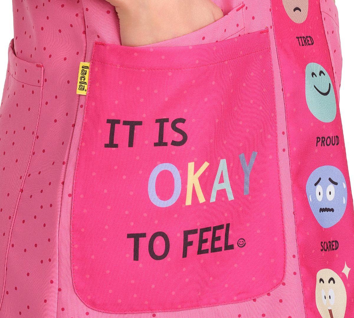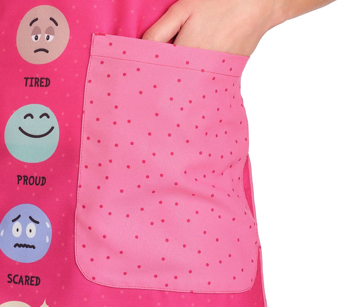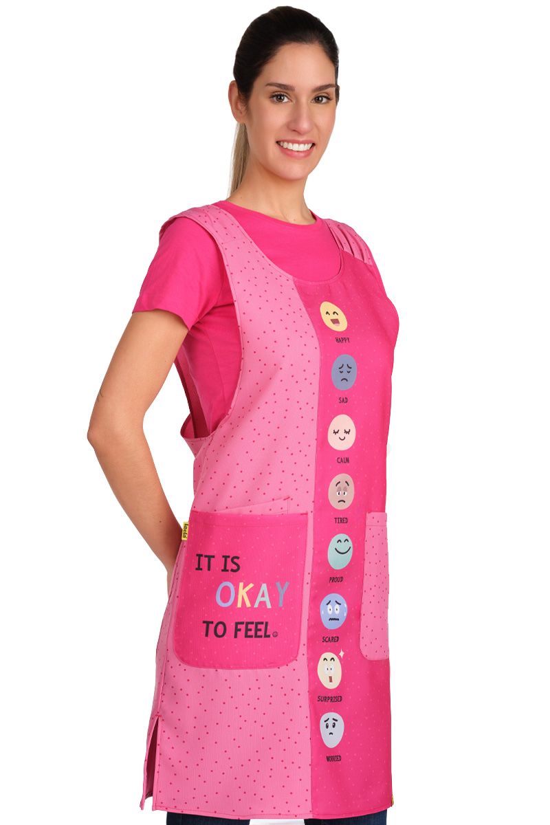 La estola para profesora Feelings de Lacla es una prenda vanguardista que integra la psicología positiva y el bilingüismo en la uniformidad escolar diaria. Confeccionada en poliéster 100% de alta durabilidad, esta estola destaca por su llamativo color rosa chicle y su diseño didáctico de emojis, diseñado para que los alumnos aprendan a reconocer y verbalizar sus emociones en inglés de forma natural. Su arquitectura técnica es superior, incorporando tres bolsillos delanteros de gran capacidad y un innovador cuarto bolsillo en la espalda para un almacenamiento perimetral completo. Gracias a sus detalles de fruncido decorativo en los hombros, sus cortes laterales de alta adaptabilidad y un elegante diseño cruzado en la espalda, la estola Feelings garantiza un ajuste ergonómico perfecto para múltiples tallas. Es la solución "todoterreno" ideal para docentes de educación infantil y logopedas que buscan una prenda resistente, de fácil lavado y con un propósito educativo que inspire cercanía y modernidad en el aula.