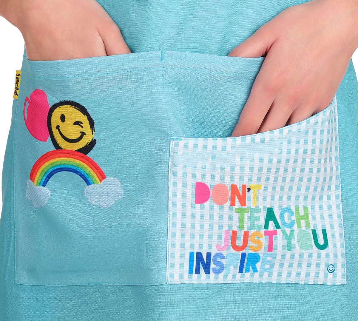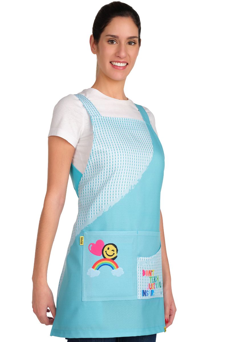 La estola para profesora Smile de Lacla es una prenda premium diseñada para docentes que entienden su labor como una fuente de inspiración constante. Confeccionada en poliéster 100% de alta resistencia, esta estola combina un elegante estampado de cuadros turquesa con un innovador diseño de tirantes asimétricos que aporta un aire moderno y vanguardista al uniforme escolar. Su funcionalidad es excepcional, integrando cuatro bolsillos estratégicos, entre los que destaca un gran compartimento segmentado en secciones interior y exterior para una organización técnica del material de aula. El diseño se completa con la icónica sonrisa de Lacla y el mensaje bordado "Don't just teach, inspire", proyectando una imagen de positividad y profesionalismo inigualable. Gracias a sus atadores laterales regulables y su tejido de fácil lavado que apenas requiere plancha, la estola Smile ofrece un ajuste ergonómico perfecto y una durabilidad "todoterreno" para el día a día en colegios y centros infantiles.