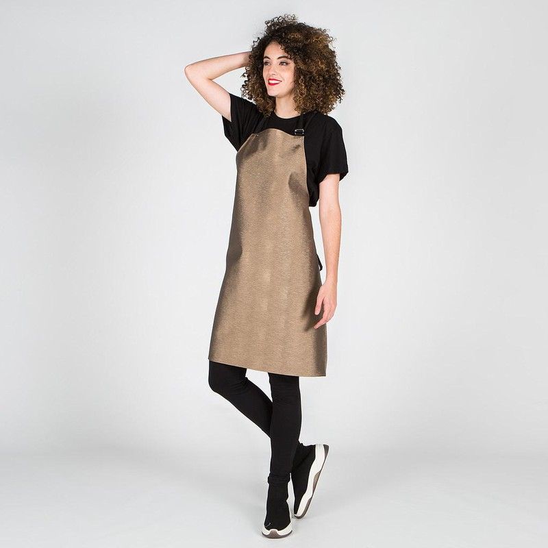 Tablier à bavette sans poches. Fabriqué en simili cuir avec texture bois. Disponible en couleurs sable et chocolat. Avec boucle de réglage pour ajuster le cou et rubans à nouer. 100 % polyester, donc résistant aux taches. Idéal pour les uniformes des coiffeurs et des centres de beauté.